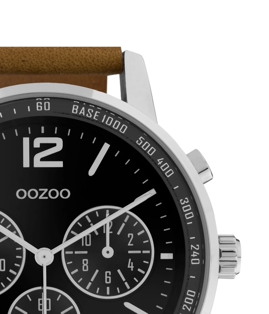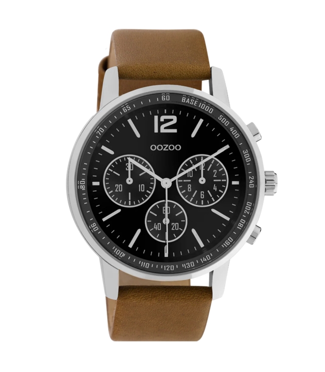 De C10812 heeft een matbruine leren band en een 42 mm zilverkleurige metalen horlogekast.