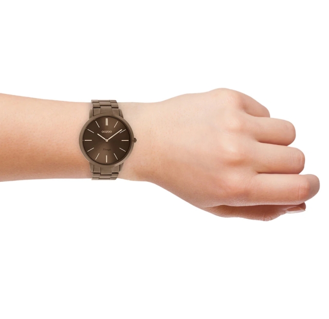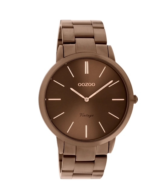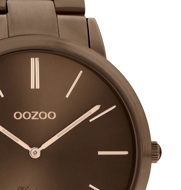 Verfijning en elegantie zijn twee elementen van onze prachtige OOZOO Vintage Classics. Dit klassieke ronde ontwerp met een eigentijdse twist is iets voor iedereen. Dit unisex horloge is de perfecte combinatie van comfort en mode met zijn 42 mm bruine metalen horlogekast en bruine sunray wijzerplaat. De mat/glanzende bruine roestvrijstalen band maakt dit horloge een all-time klassieker die je bij elke gelegenheid kunt dragen. De wijzerplaat heeft rosékleurige strepen op de cijfers en bijpassende wijzers. De C20103 is een must-have voor elke outfit. Het mineraalglas ligt in een 6,9 mm dunne metalen horlogekast met IP-coating. Dit ontwerp heeft een roestvrijstalen achterplaat en is nikkelbestendig. Dit horloge heeft een 2ATM Japans uurwerk.