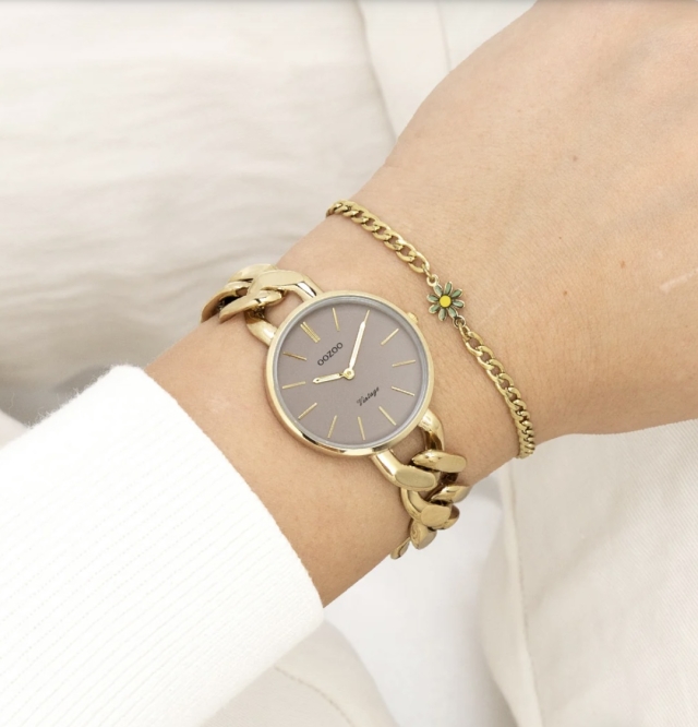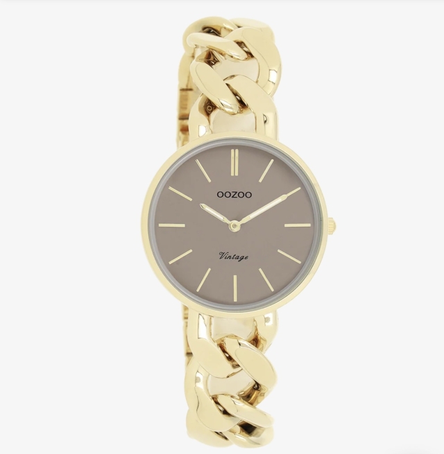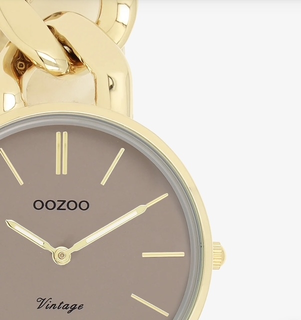 - Trendy Oozoo dameshorloge goud met mooie taupekleur wijzerplaat en goudkleurige schakelarmband