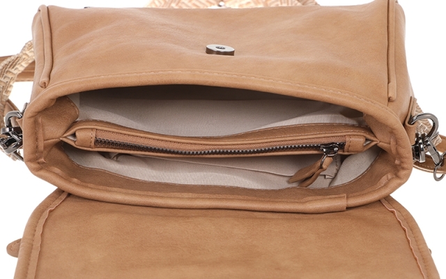 Onder de flap vind je een slim ingedeeld hoofdvak met twee open vakken, gescheiden door een centraal ritsvak. Daarnaast is er een extra opbergvakje en een veilig ritsvak aan de achterkant – ideaal voor je telefoon. Zo heeft alles een eigen, logische plek.