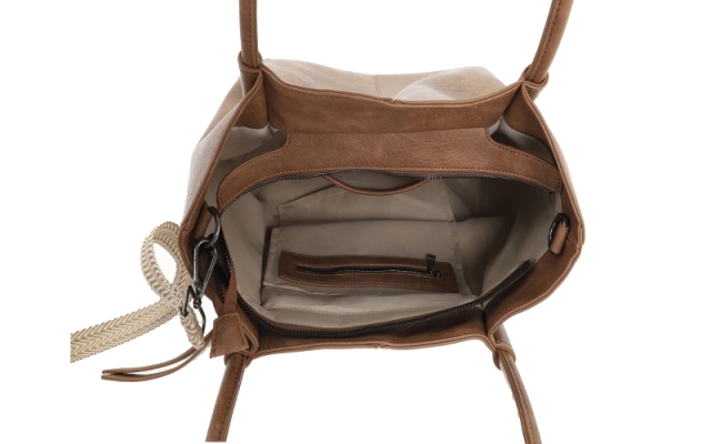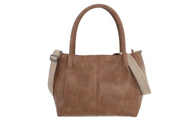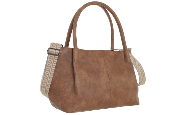 Twee looks in één: Voorzien van klassieke vaste handvatten én een opvallende, afneembare brede schouderband met zigzag-patroon.